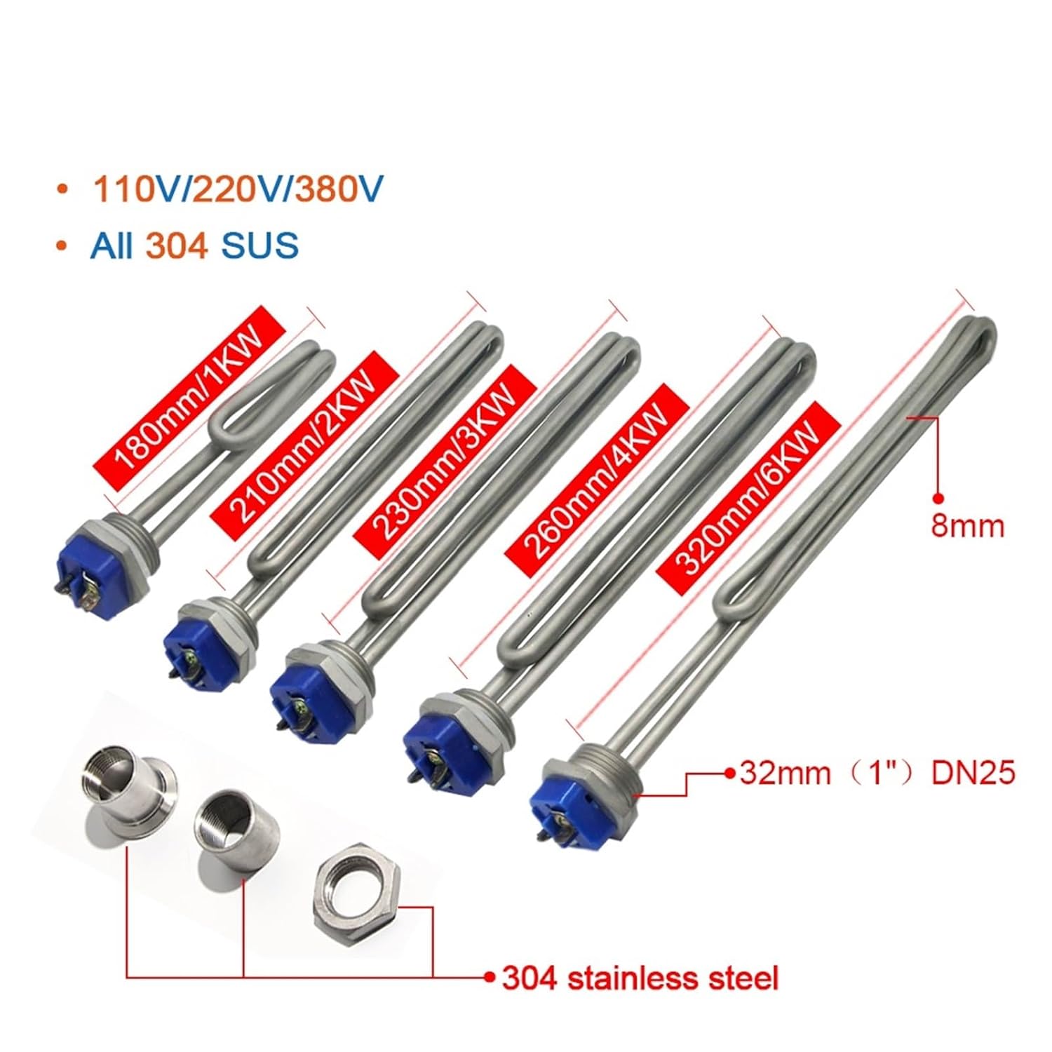 Heating Elements1Pcs Foldback Screw In Electric Water Heater Element with 1 INCH NPT Thread 1KW/2KW/3KW/4KW/6KWProduct Name: Water Heating TubeThread Size: DN25/1"/32mmThread Type: SquareTube Length: 180mm/210mm/230mm/260mm/320mmTube Diameter: 8mmVoltage: 110V/220V/380VPower: 1KW/2KW/3KW/4KW/6KWTube Material: 304stainless steelThread Material: 304stainlesssteelAccessoriesMaterial: 304stainlesssteelPackage:According to what you choosed==========Model Number : DN25 304SSOrigin : Mainland Type : Electric Water Heater PartsProduct Name : heating element with probe holdis : YESVoltage : 110V/220V/380VPower : 1KW/2KW/3KW/4KW/6KWThread Size : 1" BSP/NPTTub Diameter : 8mmApplcation 1 : heater for solar water heaterApplication 2 : heater parts for sanuaApplication 3 : heater parts for water bolierMaterial : 304 stainless steel