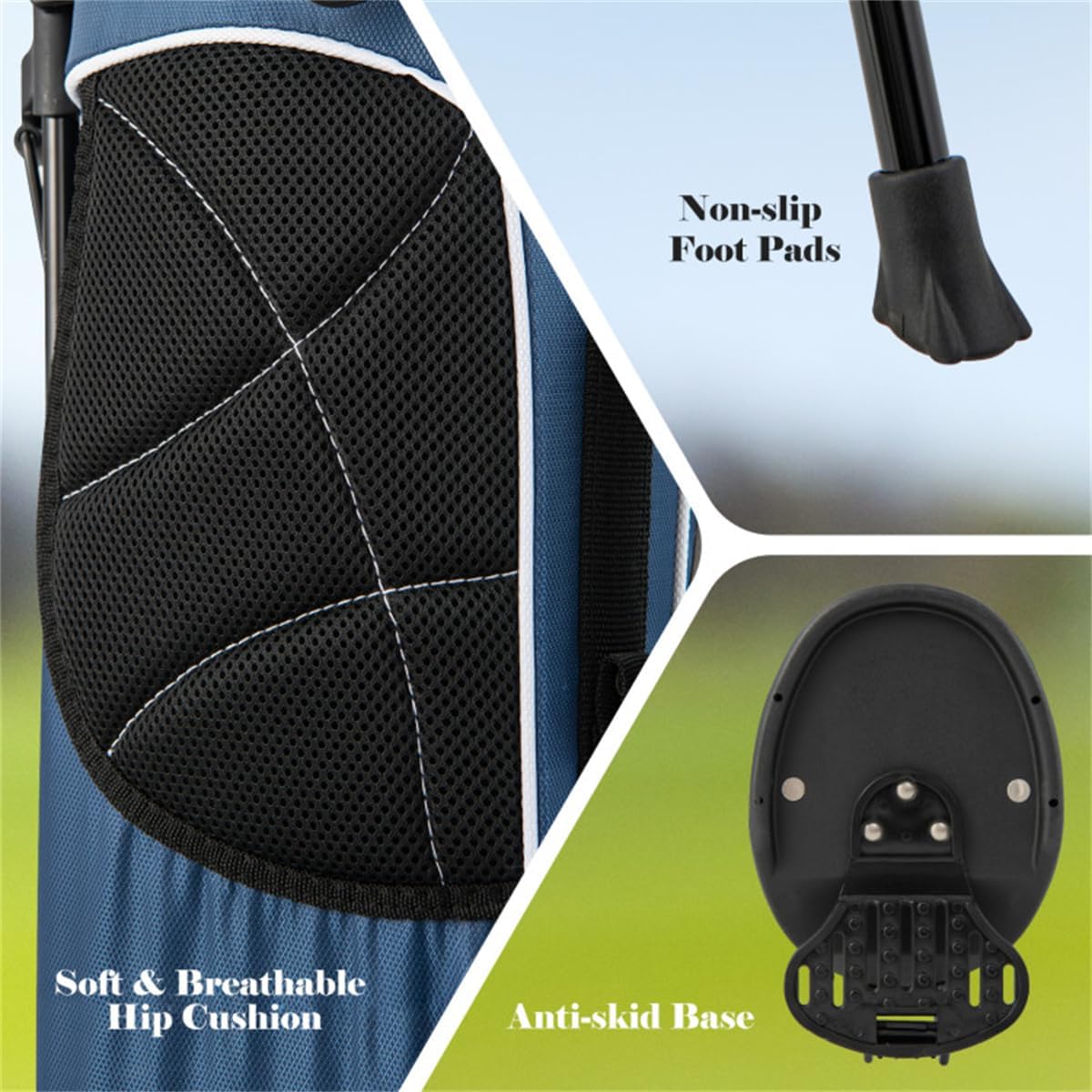 Wear Resistance: Made of polyester fabric, this golf stand bag is sturdy enough to avoid any additional wear and tear while using it. It surely guarantees you a durable lifetime for its sturdy construction and a longtime satisfactory experience. Reasonable Capacity: Featuring light weight of only 3.5 lbs and portability, carry golf stand bag 3 way dividers surprisingly offers you enough space to accommodate your golf clubs. There are 4 zipper pockets on this bag to bring you additional storage space, which you can put various accessories in. Considerate Added Values: Backpack-style shoulder strap for extra comfort provides you a convenient handle on the side to quickly carry and go. And the special zipper design adds both practicability and aesthetics to this product. Premium Travel Helper: Golf bags is quite great for traveling for it takes up very little space in a trailer, camper, or car trunk due to its compact body. You can just take it to your desired place effortlessly. And the bag can be stored neatly when you do not use it. Foot Support: With a total color of black and aluminum paint foot pipe support, it can stand steadily and balanced as you want to release your hands. And it can also stand straight with a plastic chassis. A rubber foot pipe bracket can well prevent the scratch. Color:Blue Material:Polyester Fabric, Metal, Rubber, PP Parts:Plastic chassis Size of head frame:6" x 8" Bag length:35" Unit weight:3.5 lbs