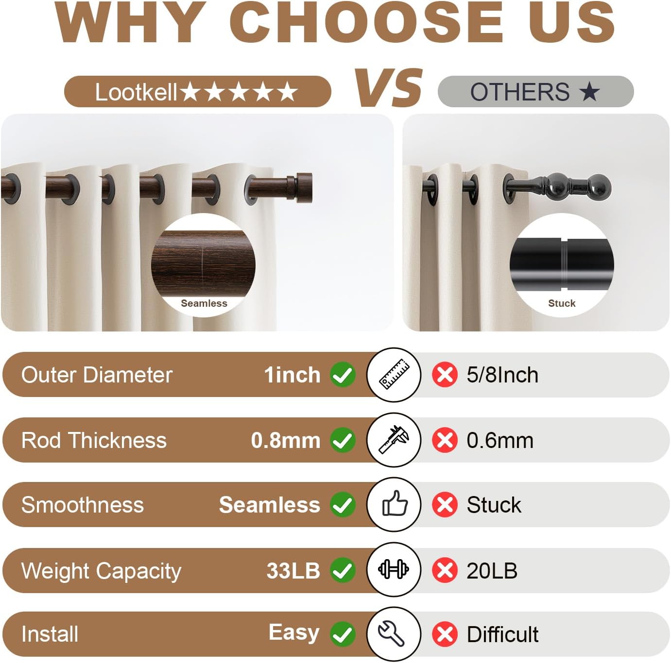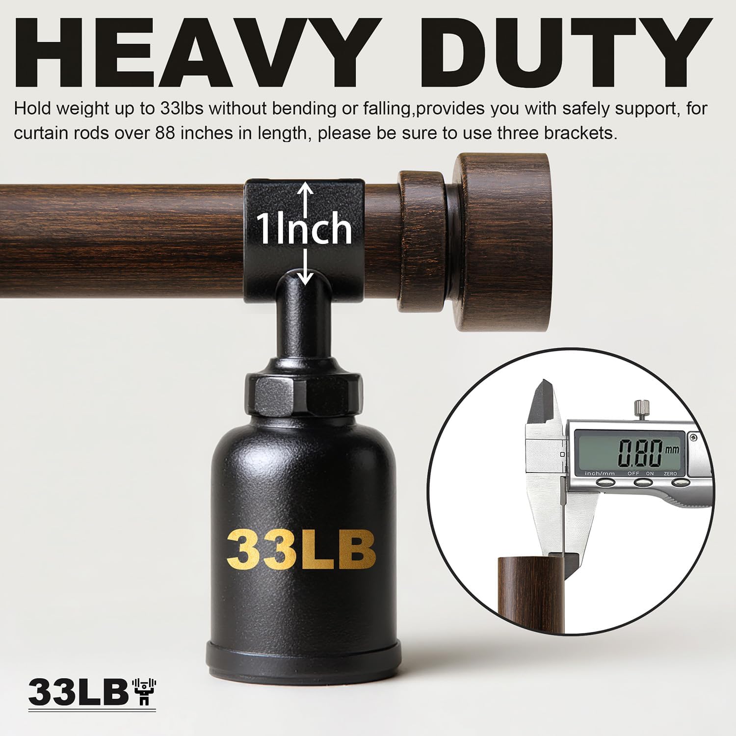 Deep Walnut Wood Grain Curtain Rods for Windows 66 to 120 Inches 1" Diameter Heavy Duty Window Curtain Rod Adjustable with Solid Finials for Living Room Bedroom Kitchen Farmhouse Outdoor