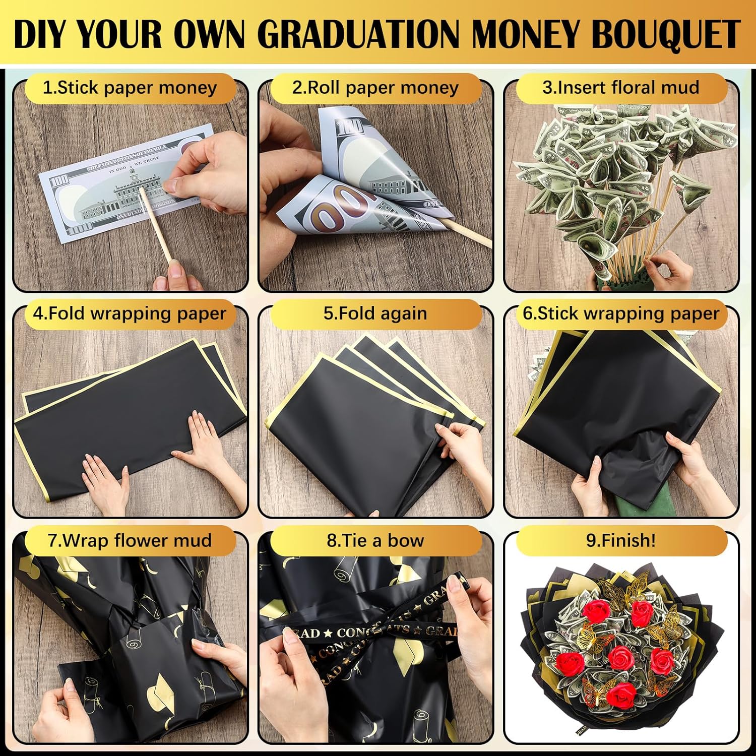 Features: This graduation bouquet kit is designed for a graduation theme cash bouquet. It comes with graduation element inserts and 3D butterflies to add more meaning and significance to your gift. It will not only be a gift but also a symbol of achievement and congratulations for the graduate. With this DIY money bouquet kit, you can personalize your present to make it even more memorable and impactful. Each of these elements come together to create a strikingly appealing and unforgettable graduation present. Specifications: Material: pet plastic composite paper, paper, plastic, stainless steel, ribbon, foam Main color: black, gold Size: Wrapping paper: about 22.44 x 22.44 inches/ 57 x 57 cm Bamboo stickers: about 11.81 x 0.16 inches/ 30 cm x 4 mm Butterfly: about 4.72 inches/ 12 cm, about 3.94 inches/ 10 cm, about 3.15 inches/ 8 cm Ribbon: about 0.79 inches/ 2 cm in width, about 10 yards in length Package includes: 100 x Disposable sticks, 2 x flower mud 30 x Flower wrapping paper, 12 x graduation element inserts 8 x Blank greeting cards, 24 x 3D butterfly 50 x Diamond needles, 1 x tape cutter, 2 rolls of tape, 1 roll ribbon Notes: Manual measurement, please allow slight errors on size. The color may exist a slight difference due to different screen displays.