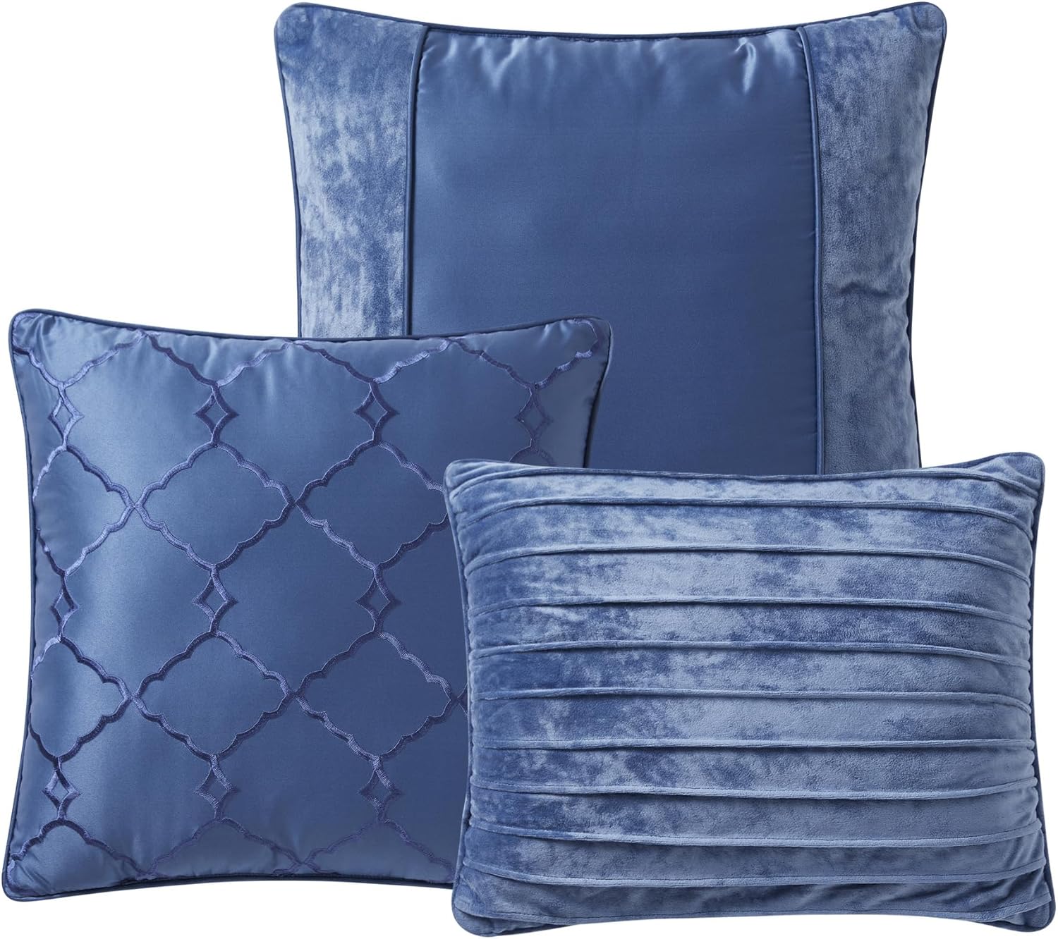 Indulge in the ultimate luxury with our 7 Piece Comforter Set, crafted from premium crushed velvet. This high-end bedding set is designed to provide unmatched comfort and style, transforming your bedroom into a haven of sophistication and elegance. The set includes a comforter, two shams, one bed skirt, and three decorative throw pillows, offering a complete solution for a cohesive and luxurious look.The soft, plush texture of crushed velvet offers a sumptuous feel that ensures a cozy and inviting sleep environment. The elegant sheen and rich color of the fabric add a touch of sophistication, making your bed the stylish centerpiece of your bedroom. Each piece in this set is thoughtfully designed to complement the others, creating a harmonious and visually appealing ensemble.Our comforter set is crafted with meticulous attention to detail, ensuring superior quality and durability. The comforter is generously filled to provide warmth and comfort without being overly heavy, offering the perfect balance for a restful night's sleep. The shams and bed skirt are made from matching crushed velvet, completing the look with seamless coordination. The decorative throw pillows feature intricate designs and embellishments, adding an extra touch of elegance and sophistication to your bedding.Despite its luxurious appearance, our comforter set is designed for easy care and maintenance. The crushed velvet material is durable and resistant to wear, ensuring long-lasting beauty. To keep your bedding looking fresh and pristine, simply machine wash on a gentle cycle and tumble dry on low heat. This convenience allows you to enjoy the luxury of high-end bedding without the hassle of complicated care routines.The timeless design of our crushed velvet comforter set makes it a versatile addition to any bedroom decor. Whether your style is modern, traditional, or somewhere in between, this set seamlessly blends in, adding a touch of elegance and sophistication to your space. The rich colors and luxurious texture create a statement piece that enhances the overall aesthetic of your bedroom, making it a place of relaxation and beauty.Invest in the ultimate comfort and style with our 7 Piece Comforter Set. Perfect for those who appreciate the finer things in life, this high-end bedding set offers unparalleled softness, durability, and elegance. Elevate your bedroom decor with the luxurious feel of crushed velvet and enjoy the complete bedding solution that this set provides. Transform your bed into a sanctuary of comfort and sophistication, and experience the difference that premium quality and thoughtful design can make.Queen Size Dimensions:1- Comforter: 90" x 90" 2- Pillow Shams: 20" x 26" each 1- Bed Skirt: 60" x 80" + 14" 1- Square Dec Pillow: 18" x 18" 1- Square Dec Pillow: 16" x 16" 1- Rectangle Dec Pillow: 12" x 20" King Size Dimensions:1- Comforter: 104" x 90"2- Pillow Shams: 20" x 36" each1- Bed Skirt: 78" x 80" + 14"1- Square Dec Pillow: 18" x 18"1- Square Dec Pillow: 16" x 16"1- Rectangle Dec Pillow: 12" x 20"