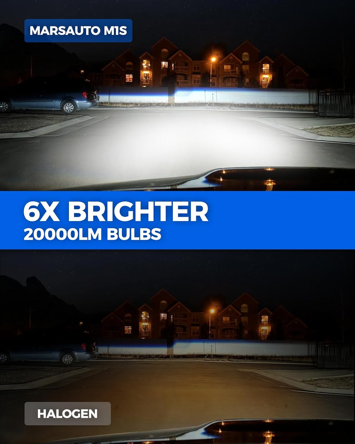 【800% Breakthrough Brightness】Marsauto 9012 bulb shine 800% brighter than traditional bulbs. M1S 9012 HIR2 bulb uses non-traditional chip technology, and its light output is much higher than other chips on the market. At the same time, the number of lamp beads on a single side has been increased from one to two, which solves the problem of low lumen caused by one lamp bead and can also increase the width of illumination, escorting car owners at night.