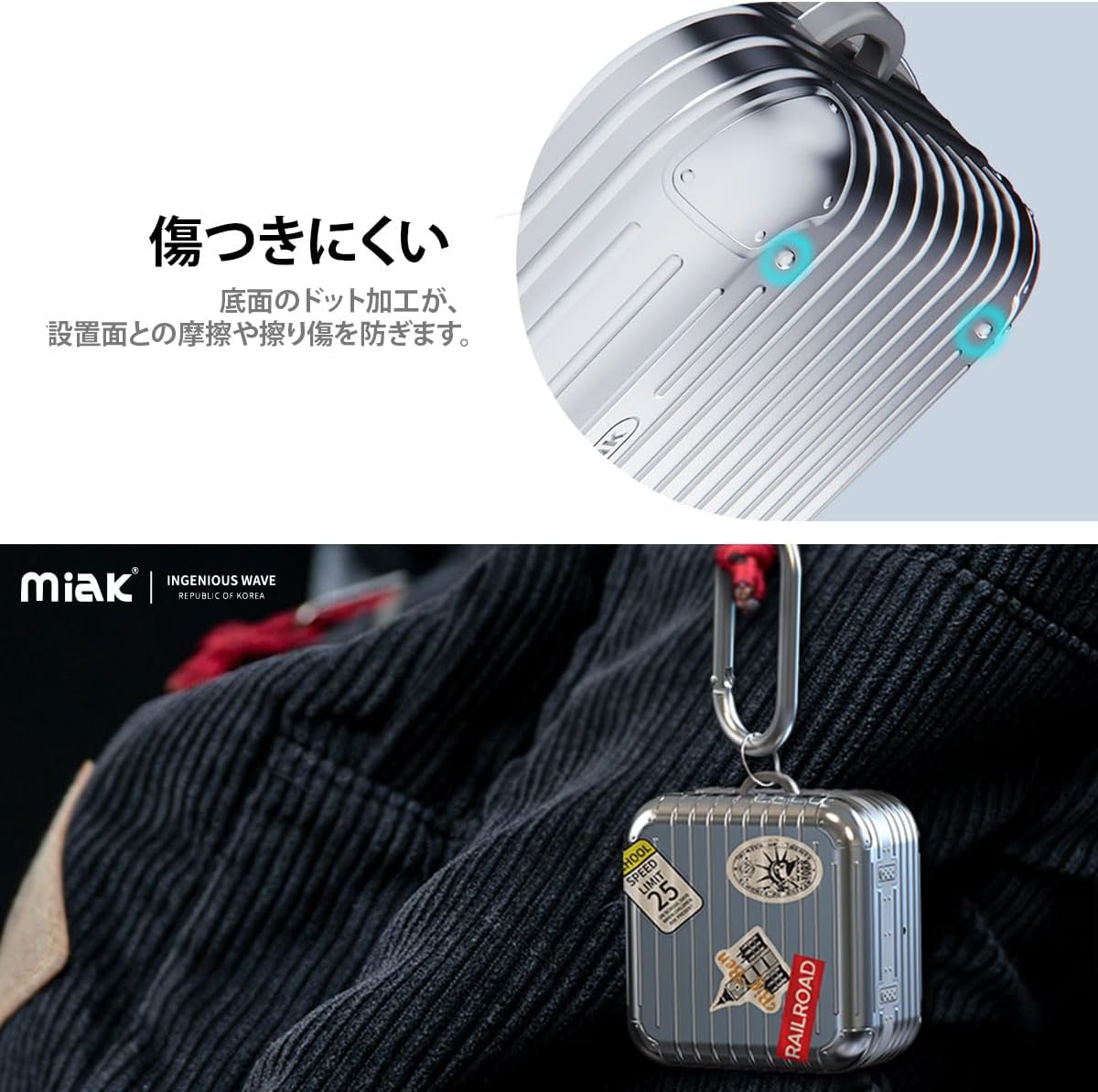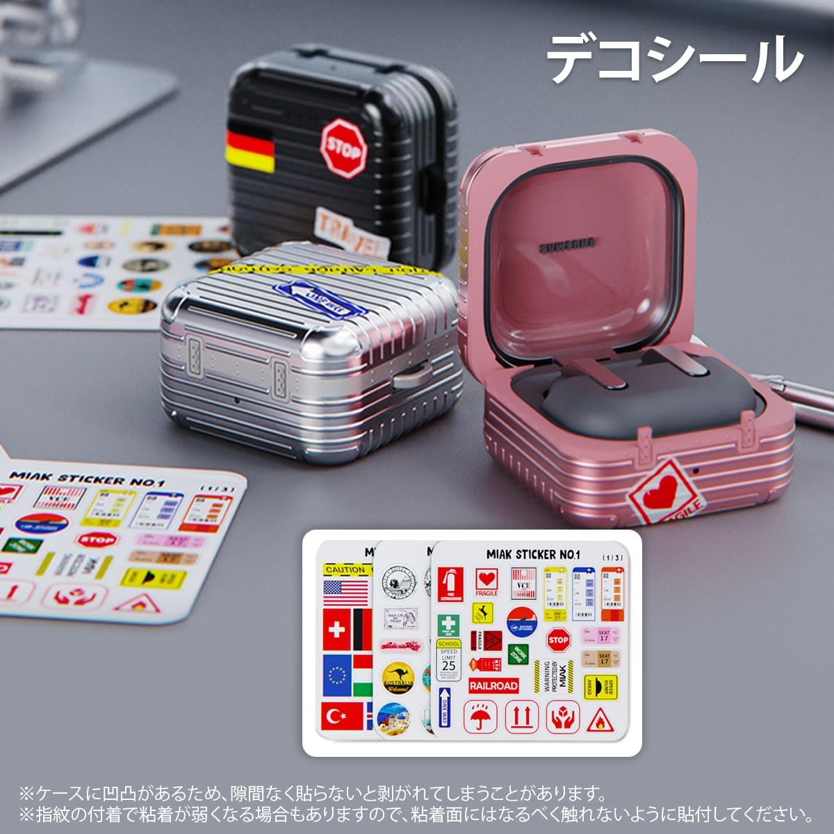 Miak "Carrying Case" is a unique Galaxy Buds case design with meticulous details. The dual layer structure of soft TPU and hard polycarbonate provides extra protection and comes with a carabiner for easy carrying. Unique suitcase design Exquisite design reproduces the details of your suitcase. Easy to use separate type The Galaxy Buds charging case lid and earphone compartment are separated to protect it from separate parts, making it easy to install and remove. Please be sure to check the front and back of the case before installation. It will not be able to open and close properly if you install it backwards or Deco sticker A perfect Galaxy Buds carrying case is included with your flag or emblem decal. You can enjoy your own customized design. ※Because the case is uneven, it may come off if you do not apply it without any gaps. The adhesive may weaken due to fingerprints, so please do not touch the adhesive surface as much as possible. Meticulous details SMOOTH OPEN AND CLOSE: Precision design ensures smooth opening and closing without stress. Convenient to carry: Comes with a sturdy metal carabiner that can be attached to your bag or belt loop. Strong load on the joints may cause damage or fall off. SCRATCH RESISTANT: Dots on the bottom prevent rubbing and scuffing on the surface. Durable double layer construction Dual layer structure with soft TPU interior and hard PC exterior for extra protection. Compatible with LED displays. The Galaxy Buds charging case has a special hole to match the LED lamp position so you can check the charging status. Supports wireless charging. Supports cable charging and wireless charging with the case on