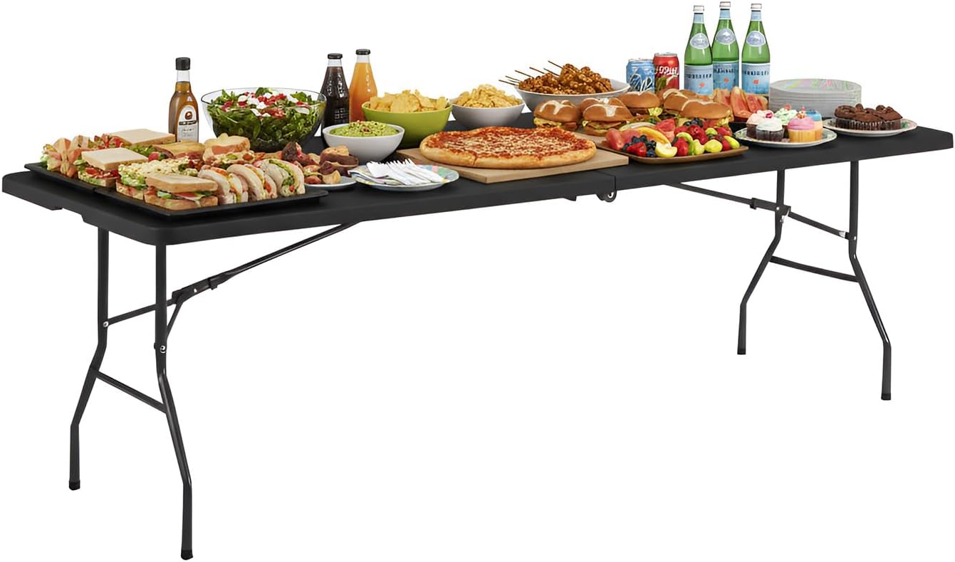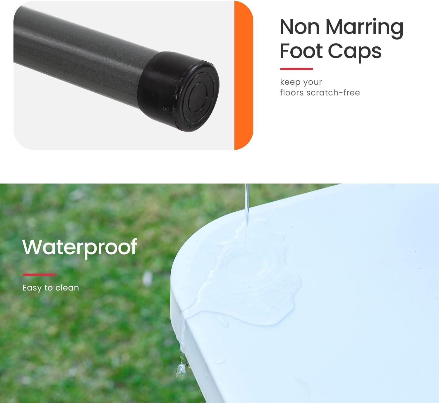 The Outdoor Dining Table is perfect for indoor/out door,such as parties,BBQ, weddings, camping, garden, dining.it has a heavy-duty white plastic top and powder-coated steel tube frame for stability. Specifications: Folding size:35.4inch*29.1inch Dimensions (Open): 71" L x 29" W x 29" H; Weight Capacity: 500 lbs Features: Stain Resistant and Easy to Clean. Convenient Carry Handle. Indoor/Outdoor Use. High density UV protection With Powder-coated steel.