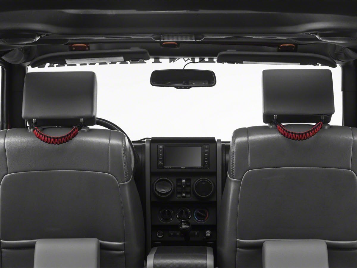 Military-Strength Grab Handles. These Black and Red Headrest Paracord Grab Handles afford your passengers a safe, rugged anchoring point that'll never rip, tear, or break. That's because these Grab Handles are constructed from 3 strands of woven Paracord, the same rope the US Military uses for paratroopers' chutes and for tying down equipment and securing tents in extreme weather. Need to Tie in a Pinch? These Paracord Grab Handles are constructed using actual 550-test Paracord, and can be unwound in an emergency and used to secure or tie down anything. From pitching a tent and securing food in the tree line to fastening a makeshift harness or game trap if you need high-strength rope in a pinch, this is the answer. Installation. Installation is about as fast as you can take off your headrests and put them back on. Simply remove your headrests, place each Grab Handle's ends onto your headrest posts, and slip them back in. Application. These Black and Red Headrest Paracord Grab Handles are the perfect solution for any 2007-2023 Wrangler JK and JL.
