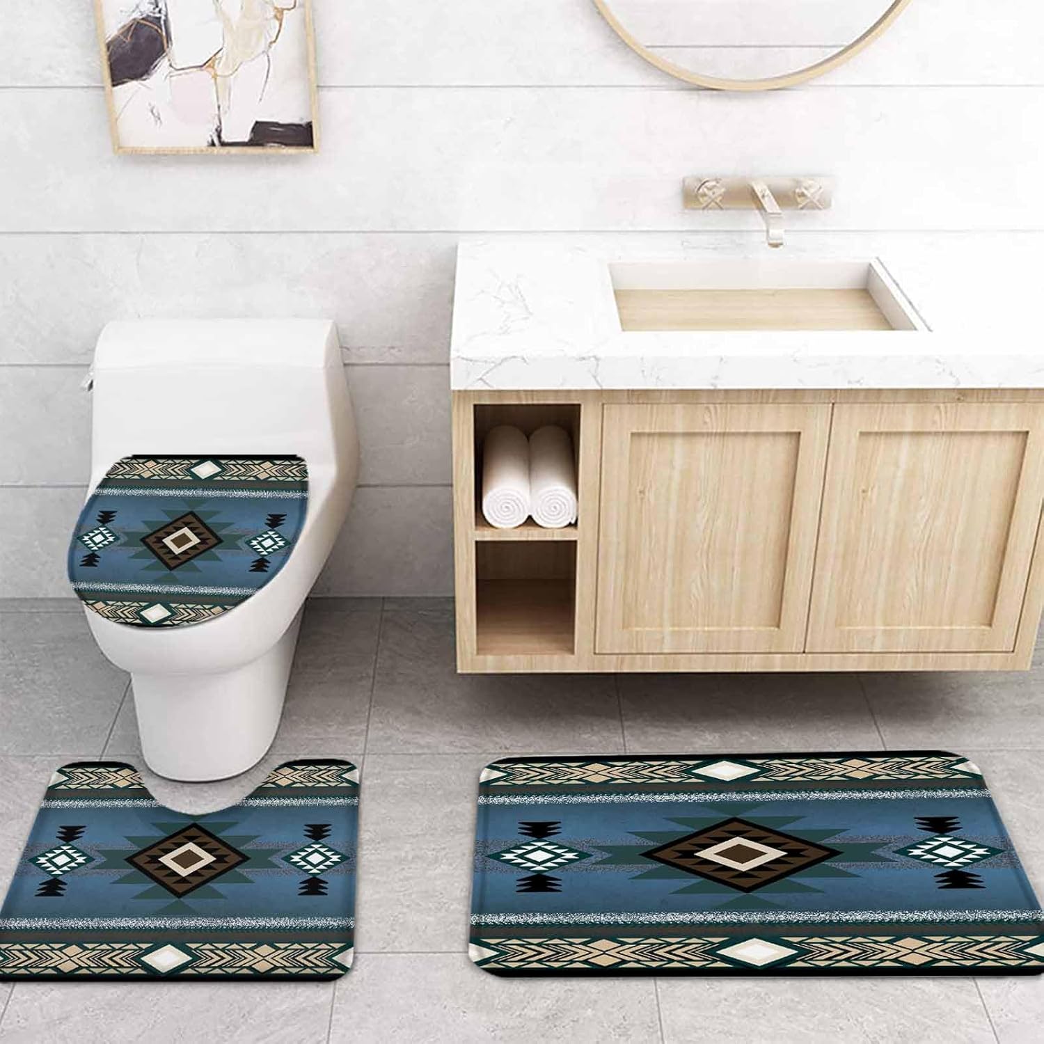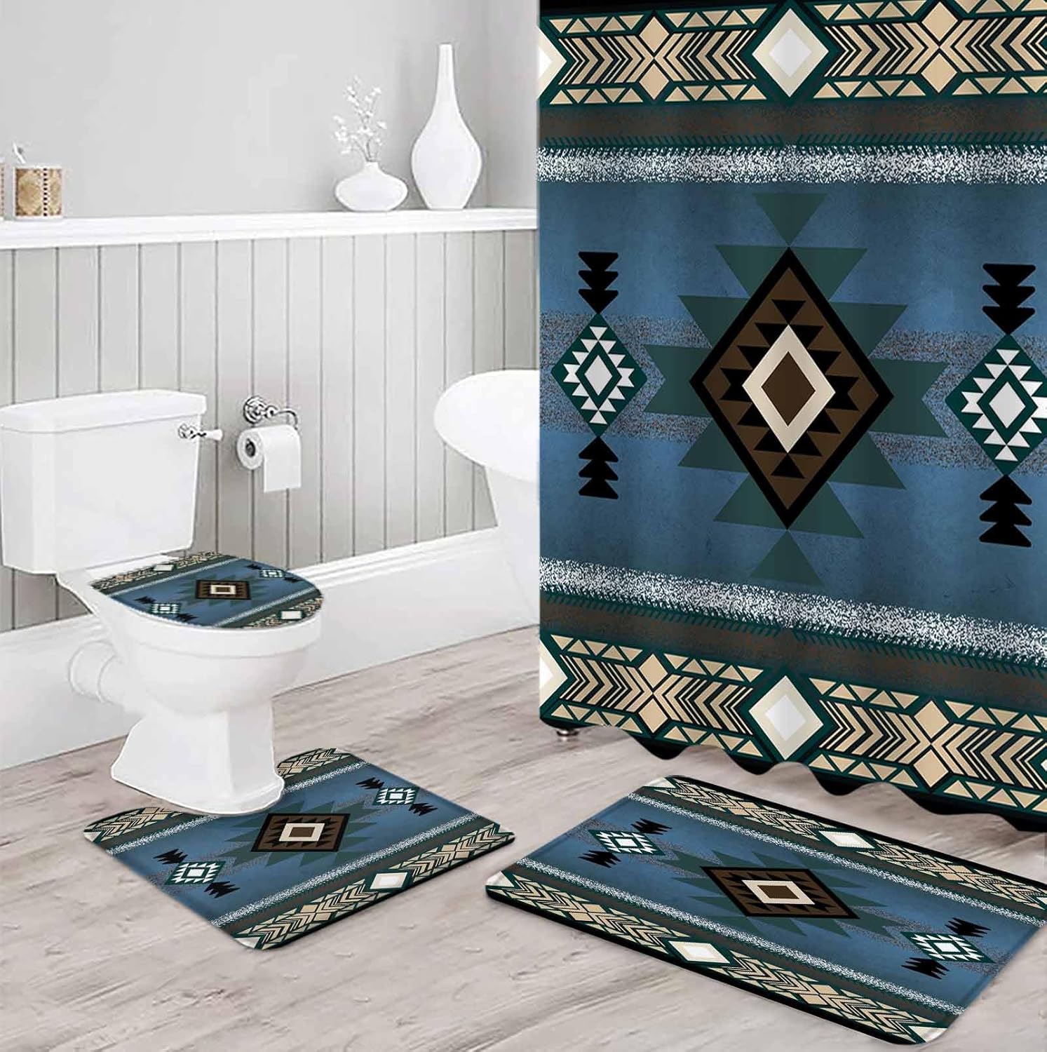 Elevate Your Shower Space – Transform your daily shower routine into a spa-like experience with our all-in-one shower curtain set Coordinated Design for a Polished Look All pieces feature matching patterns and colors, so you don’t need to spend time mixing and matching separate bathroom accessories. The style blends seamlessly with modern, classic, or minimalist bathroom decor, elevating the overall aesthetic of your bath space. Easy Installation & Use The shower curtain comes with evenly spaced buttonholes, compatible with most standard shower curtain hooks (hooks included). Just thread the hooks through the holes and hang on your shower rod. The 3 mats lay flat quickly and provide targeted coverage—full rug for shower exits, lid mat for toilet seats, U-shaped mat for toilet base areas. Exquisite Patterns Shower curtains set adopts advanced digital HD printing technology,the image is clear, does not fading, polyester fabric, odorless, beautiful and generous, can give your bathroom environment a new look. Simple Care Routine Machine wash the shower curtain with like colors on a gentle cycle and tumble dry on low heat (no bleach). Spot clean the mats with a mild cleaner and damp cloth, or machine wash as needed and air dry to keep the set looking tidy. Ideal Gift for Holidays & Occasions Great for gifting on Easter, Flag Day, Valentine's Day, Mother’s Day/Father’s Day, Independence Day, and housewarming parties. Whether it is given to your family, parents, friends, relatives, boyfriends or girlfriends, neighbors, colleagues, or yourself, it should be fun and authentic. Warm Tips Measure your shower rod length and bathroom floor space before purchase to ensure the set fits your specific layout. Allow the mats to air dry completely after cleaning before placing them back on the floor to maintain their shape.